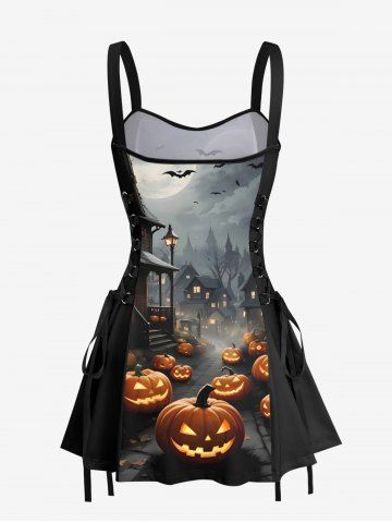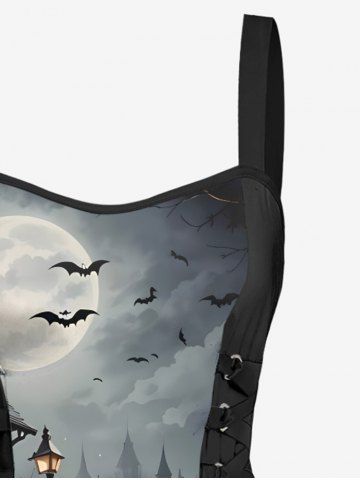 Pumpkin Village Bat Moon Print Halloween Costume Lace Up A Line Tank Dress - Black - L