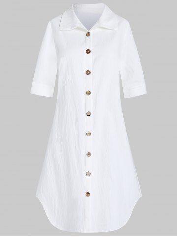 Shirt Plaid Print Insert Belted Turn Down Collar A Line Midi Button-up Casual Dress - White - L