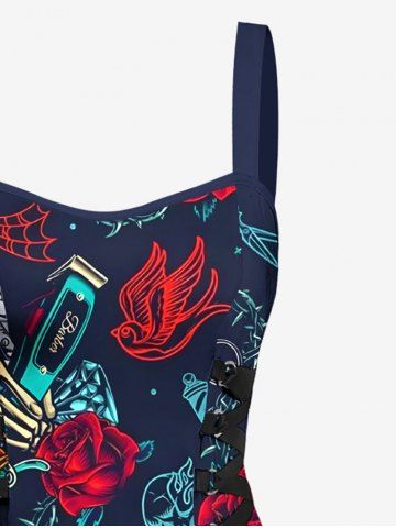 Skull Rose Flower Heart Diamond Print Lace Up A Line Tank Dress - Deep Blue - M