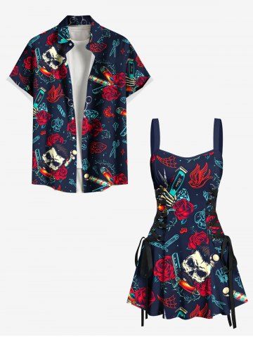 Skull Rose Flower Heart Diamond Print Lace Up A Line Tank Dress - Deep Blue - Xl