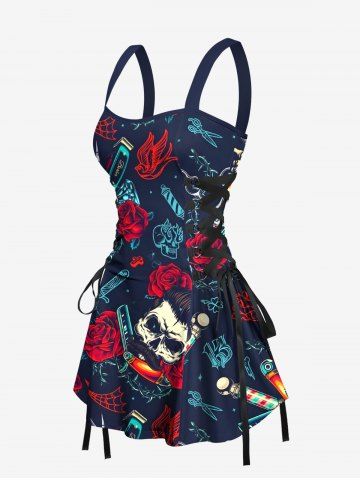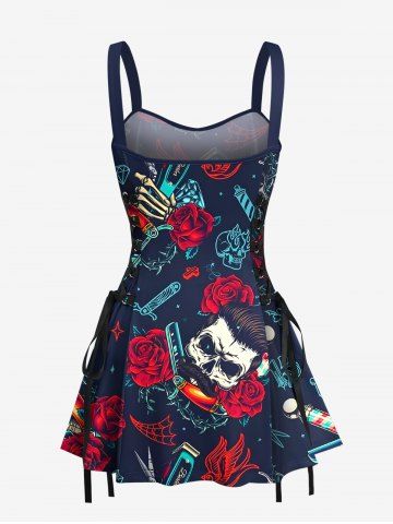 Skull Rose Flower Heart Diamond Print Lace Up A Line Tank Dress - Deep Blue - Xxl
