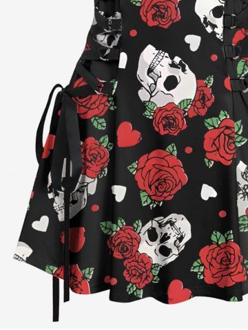 Skull Rose Flower Leaf Heart Print Hawaii Lace Up A Line Tank Dress - Red - L