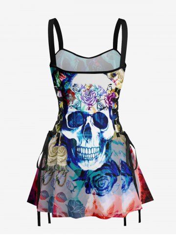 Skull Rose Flower Print Lace Up Hawaii Tank Dress - Blue - Xl