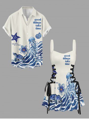 Starfish Jellyfish Turtle Flowers Print Lace Up Hawaii Tank Dress - Blue - Xl