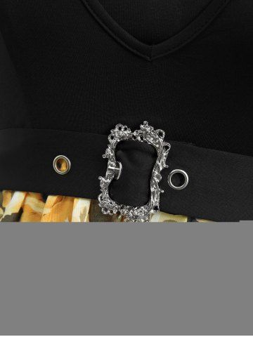 Sunflower Plaid Print Halter A Line Dress with Removable Belt - Black - L