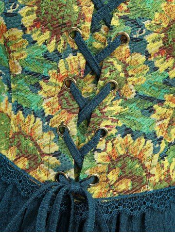 Sunflowers Print Lace Trim Lace-up Pockets Tank Dress - Deep Green - Xxl