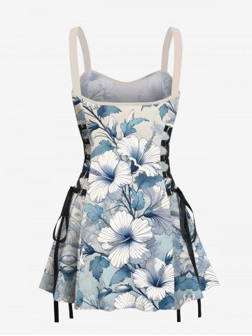 Tropical Hibiscus Flower Leaf Print Lace Up Hawaii Tank Dress - Multi-a - Xxxl