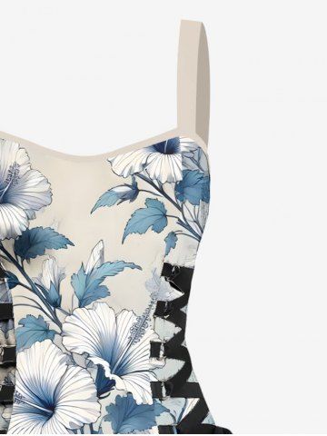 Print Dresses > Tropical Hibiscus Flower Leaf Print Lace Up Hawaii Tank Dress