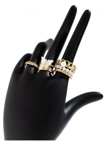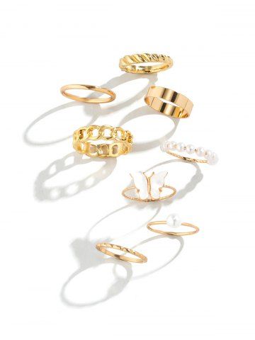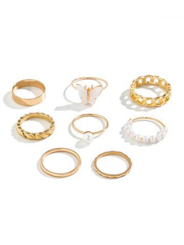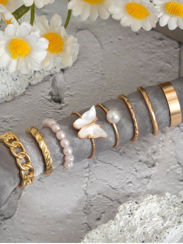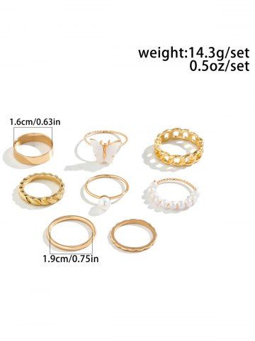 8Pcs Butterfly Faux Pearl Rings - Golden
