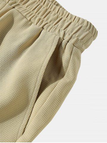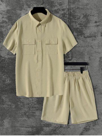 Men's Basic Plain Color Double Flap Pockets Design Textured Button Front Short Sleeves Shirt and Shorts Casual Set - Beige - S