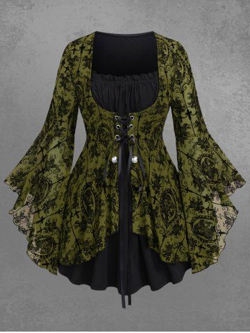 Gothic Bell Sleeves Cross Floral Mesh Flocking Lace Up Ruched Ruffles 2 in 1 Long Sleeves Top - Deep Green - 1x | Us 14-16