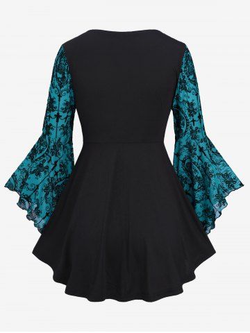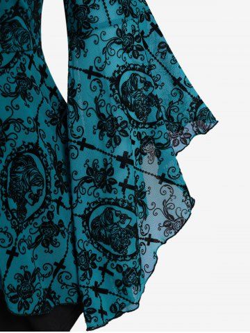 Gothic Bell Sleeves Cross Floral Mesh Flocking Lace Up Ruched Ruffles 2 in 1 Long Sleeves Top - Sky Blue - M | Us 10