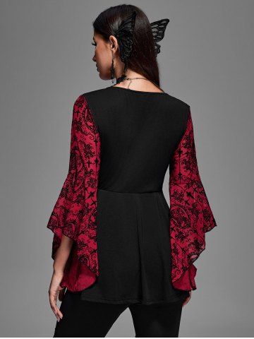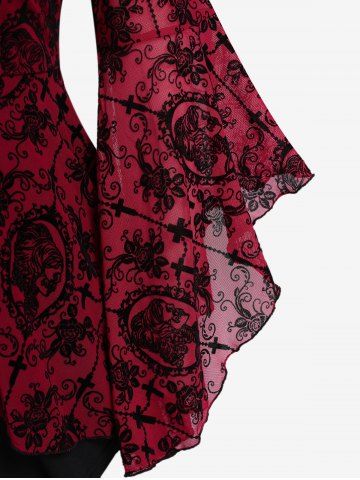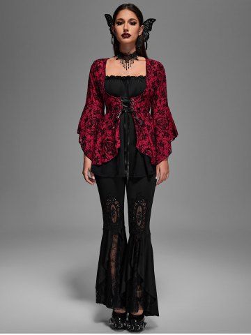 Gothic Bell Sleeves Cross Floral Mesh Flocking Lace Up Ruched Ruffles 2 in 1 Long Sleeves Top - Deep Red - M | Us 10