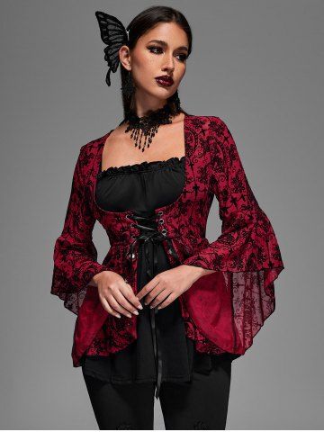 Shirts & Blouses > Gothic Bell Sleeves Cross Floral Mesh Flocking Lace Up Ruched Ruffles 2 in 1 Long Sleeves Top