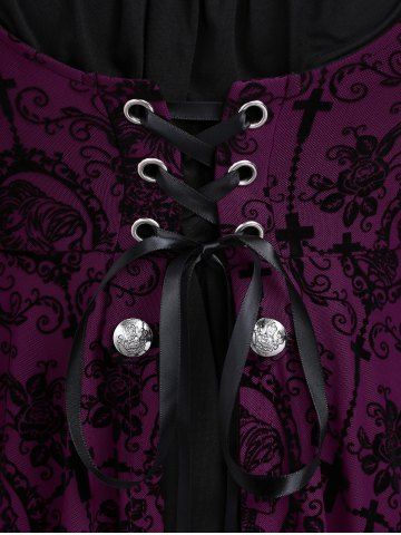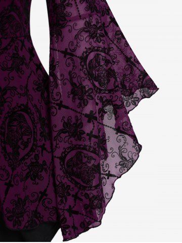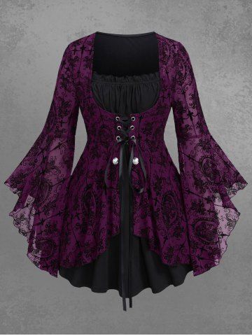 Gothic Bell Sleeves Cross Floral Mesh Flocking Lace Up Ruched Ruffles 2 in 1 Long Sleeves Top - Concord - L | Us 12