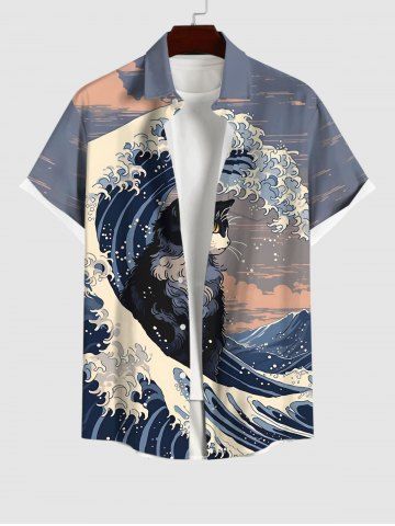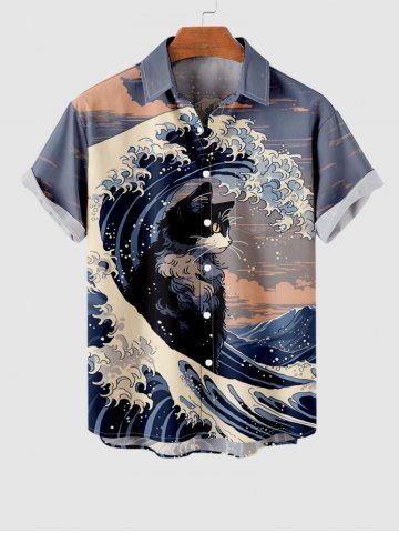 Short Sleeves Shirts > Men's Cat Sea Waves Cloud Print Buttons Pocket Shirt