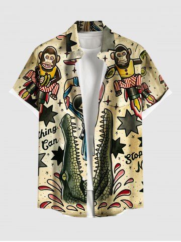 Plus Size Acrobatics Monkey Girl Crocodile Star Print Buttons Pocket Hawaii Shirt For Men - Beige - 4xl