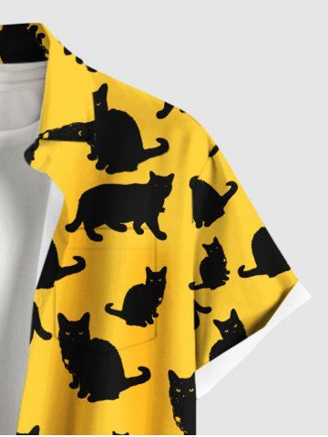 Plus Size Black Cats Print Buttons Pocket Hawaii Shirt For Men - Yellow - L