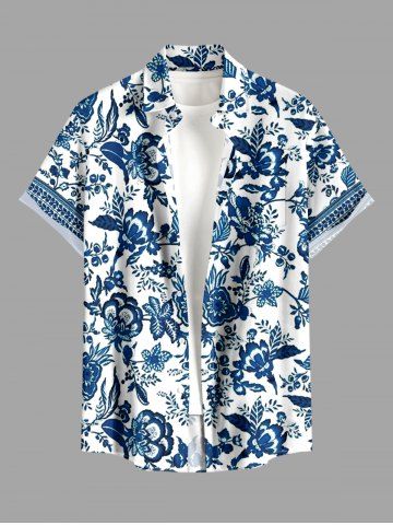 Plus Size Blue And White Porcelain Flowers Leaf Print Buttons Pocket Hawaii Shirt For Men - White - L