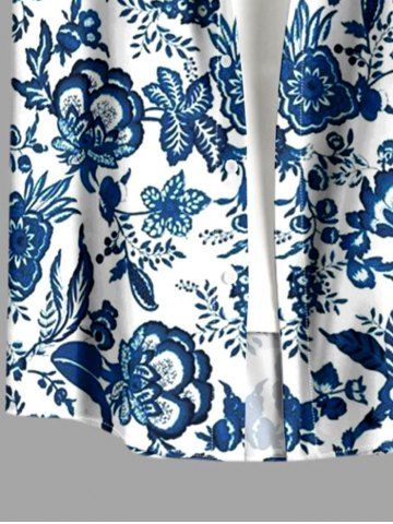 Plus Size Blue And White Porcelain Flowers Leaf Print Buttons Pocket Hawaii Shirt For Men - White - 3xl