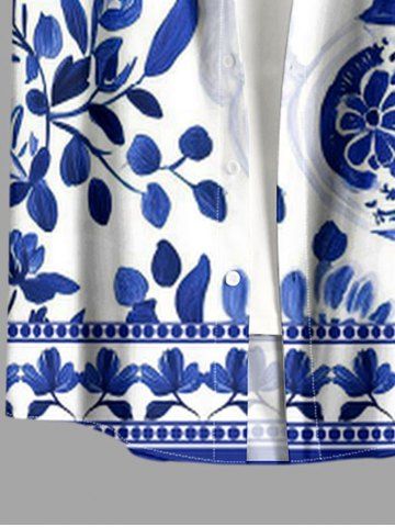 Plus Size Blue And White Porcelain Vase Flowers Leaf Print Buttons Pocket Hawaii Shirt For Men - Blue - 4xl
