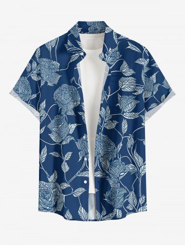 Plus Size Branch Leaf Flower Print Hawaii Button Pocket Shirt For Men - Deep Blue - S