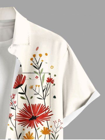 Plus Size Cat Flowers Butterfly Print Buttons Pocket Hawaii Shirt For Men - Crystal Cream - Xl