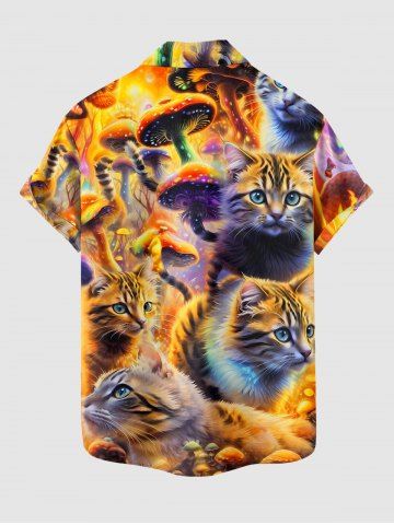 Plus Size Cat Mushroom Print Hawaii Button Pocket Shirt For Men - Golden Brown - S