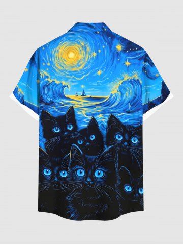 Short Sleeves Shirts > Plus Size Cat Sea Waves Painting Galaxy Print Hawaii Button Pocket Shirt For Men