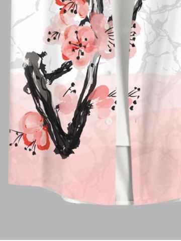 Plus Size Chinese Style Peach Blossom Branched Ombre Colorblock Print Buttons Pocket Shirt For Men - Light Pink - L
