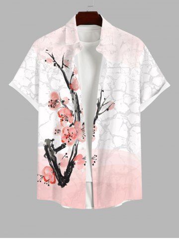 Short Sleeves Shirts > Plus Size Chinese Style Peach Blossom Branched Ombre Colorblock Print Buttons Pocket Shirt For Men