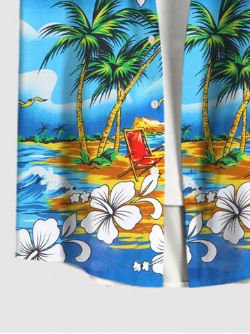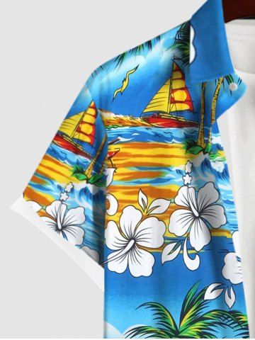 Plus Size Coconut Tree Beach Floral Sea Wave Sailboat Print Button Pocket Shirt For Men - Light Blue - Xl