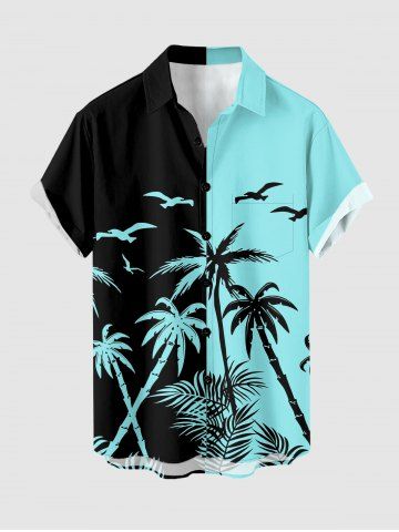 Plus Size Coconut Tree Bird Colorblock Print Buttons Pocket Hawaii Shirt For Men - Turquoise - Xl