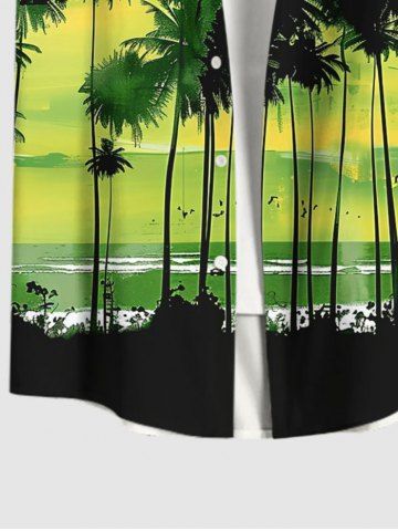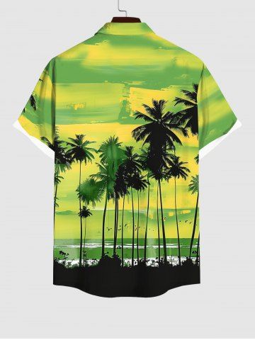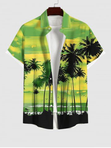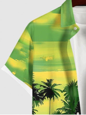 Plus Size Coconut Tree Bird Ombre Colorblock Sky Watercolor Print Buttons Pocket Hawaii Shirt For Men - Green - 3xl