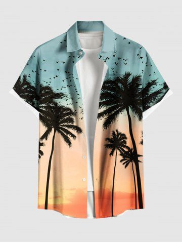 Short Sleeves Shirts > Plus Size Coconut Tree Bird Ombre Dusk Print Hawaii Button Pocket Shirt For Men