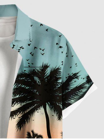 Plus Size Coconut Tree Bird Ombre Dusk Print Hawaii Button Pocket Shirt For Men - Blue Gray - L