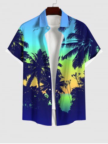Plus Size Coconut Tree Bird Ombre Print Buttons Pocket Hawaii Shirt For Men - Blue - 2xl