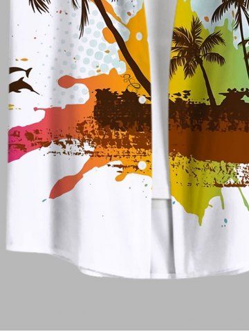Plus Size Coconut Tree Bird Paint Splatter Print Buttons Pocket Hawaii Shirt For Men - White - 3xl