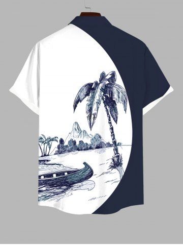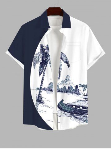 Short Sleeves Shirts > Plus Size Coconut Tree Boat Mountain Sea Colorblock Print Buttons Pocket Hawaii Shirt For Men