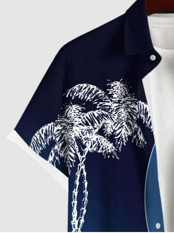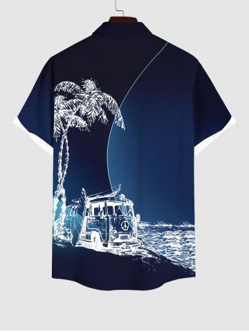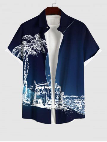 Plus Size Coconut Tree Bus Skateboard Sea Print Buttons Pocket Hawaii Shirt For Men - Midnight Blue - S