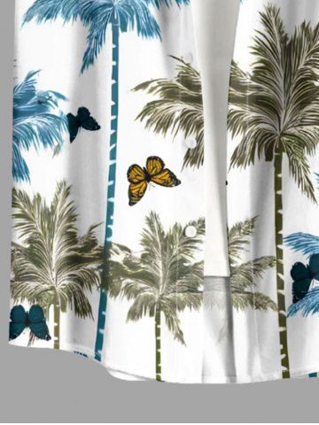Plus Size Coconut Tree Butterfly Print Hawaii Button Pocket Shirt For Men - White - S