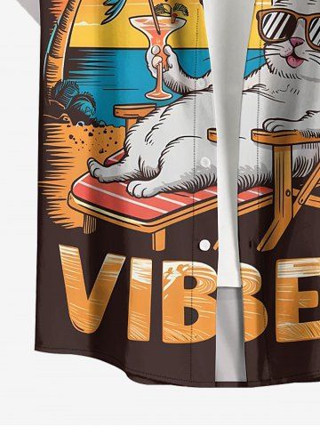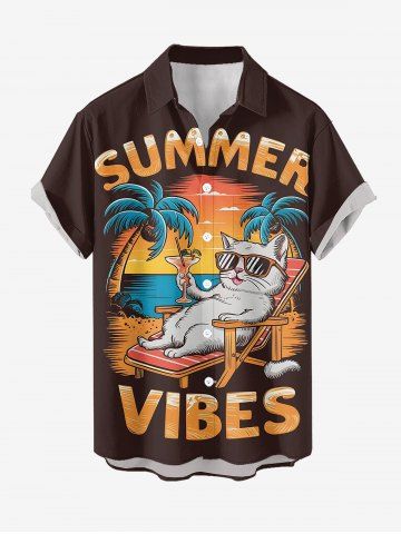Plus Size Coconut Tree Cat Seascape Letter Print Hawaii Button Pocket Shirt For Men - Brown - 4xl