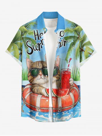 Plus Size Coconut Tree Cat Swimming Ring Letters Print Hawaii Button Pocket Shirt For Men - Sky Blue - 2xl