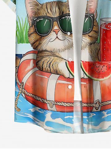 Short Sleeves Shirts > Plus Size Coconut Tree Cat Swimming Ring Letters Print Hawaii Button Pocket Shirt For Men
