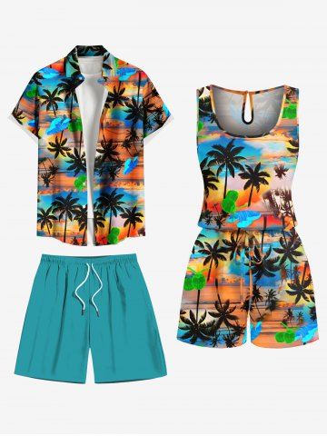 Short Sleeves Shirts > Plus Size Coconut Tree Cloud Colorful Sky Print Buttons Pocket Hawaii Shirt For Men