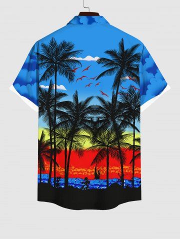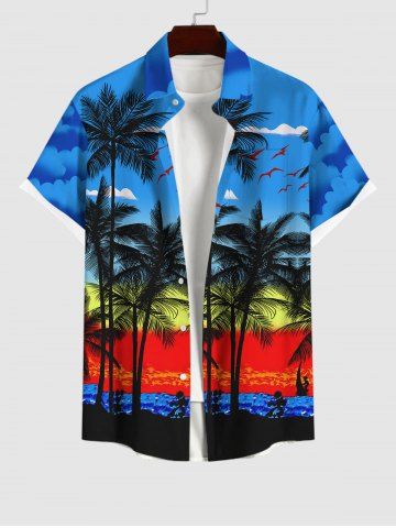 Short Sleeves Shirts > Hawaii Plus Size Coconut Tree Cloud Sea Colorblock Print Buttons Pocket Shirt For Men
