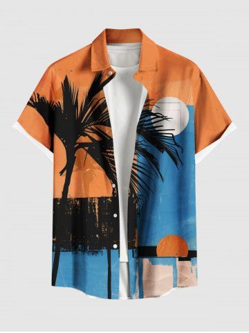 Short Sleeves Shirts > Plus Size Coconut Tree Colorblock Moon Print Hawaii Button Pocket Shirt For Men