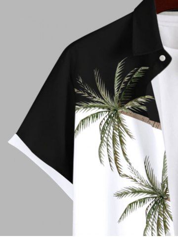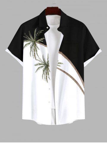 Plus Size Coconut Tree Colorblock Print Buttons Pocket Hawaii Shirt For Men - Black - L