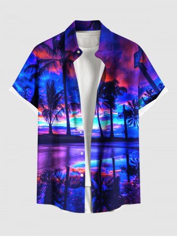 Short Sleeves Shirts > Plus Size Coconut Tree Colorful Cloud Seascape Print Buttons Pocket Hawaii Shirt For Men
