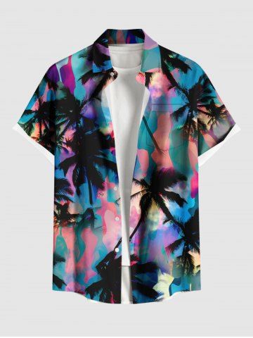 Plus Size Coconut Tree Colorful Ombre Colorblock Print Hawaii Buttons Pocket Shirt For Men - Multi-a - S